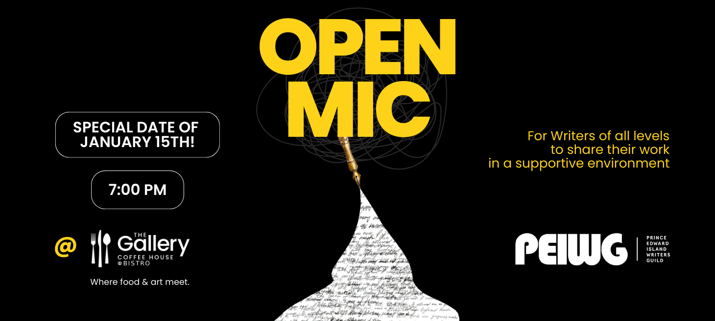 Join us for the JANUARY EDITION of our PEIWG Open Mic on Thursday, January 15th at The Gallery Coffee House & Bistro! This welcoming and supportive evening invites writers of all levels and genres to share their work in a casual, encouraging atmosphere.
